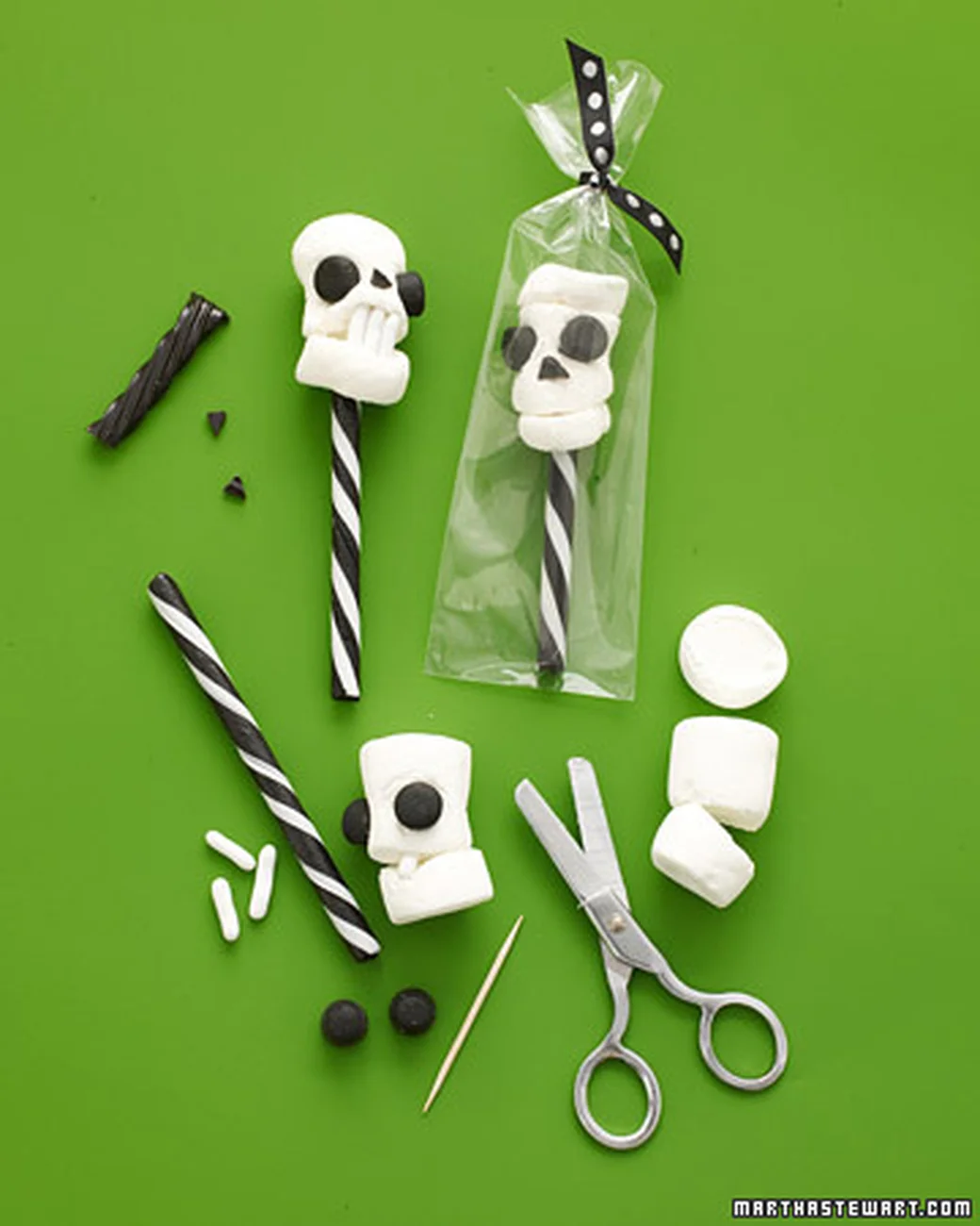 The skull pops above were inspired by some skulls I made years ago for Martha Stewart Living. For the pops above, I used jumbo and regular sized marshmallows, black M&M's, black shoestring licorice (snipped up as needed), and black large nonpariels (a.k.a. sugar pearls. The trick is cutting the marshmallow to expose it's inner stickiness and adhere cut sides to cut sides. To insert candy or sprinkles as for the facial features, poke a hole with a toothpick (again, to expose the inner stickiness) and push the candy into the sticky spot.
