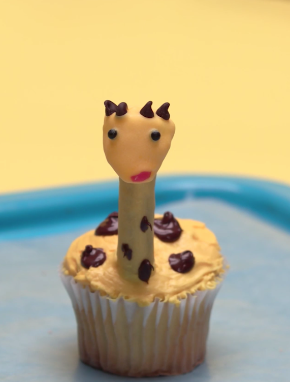 The giraffe’s horns and ears are mini chocolate chips and the mouth is made from a tiny snip of a gummy worm (save leftover scraps from making the elephant trunk!) and the eyes are black sugar pearls.