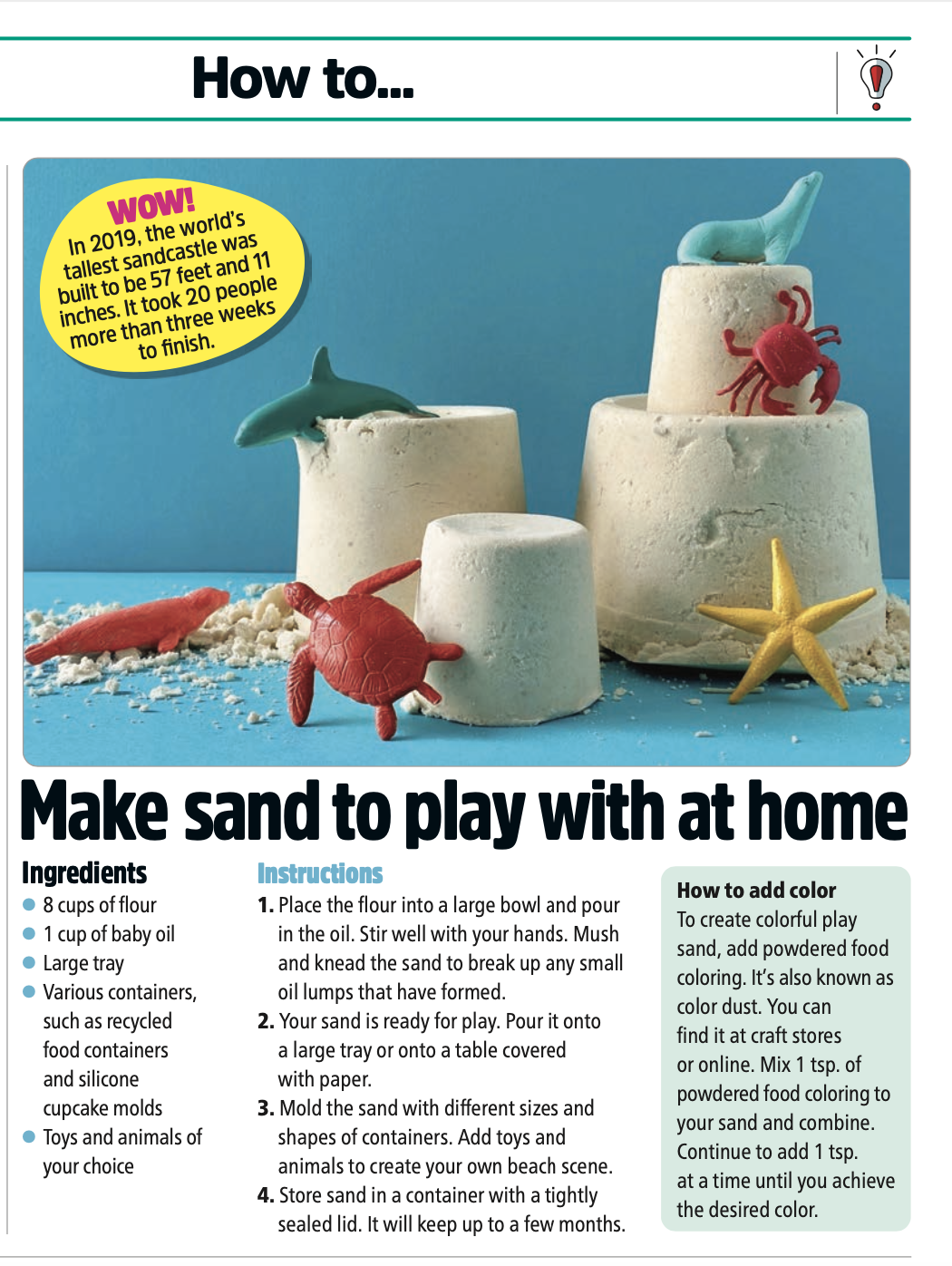 /I had so much fun making play sand for The Week Junior’s great How To column! This project is perfect for a rainy day since you (hopefully) have these ingredients already! I used baby oil but I don’t see why it wouldn’t work with another kind, like vegetable oil.