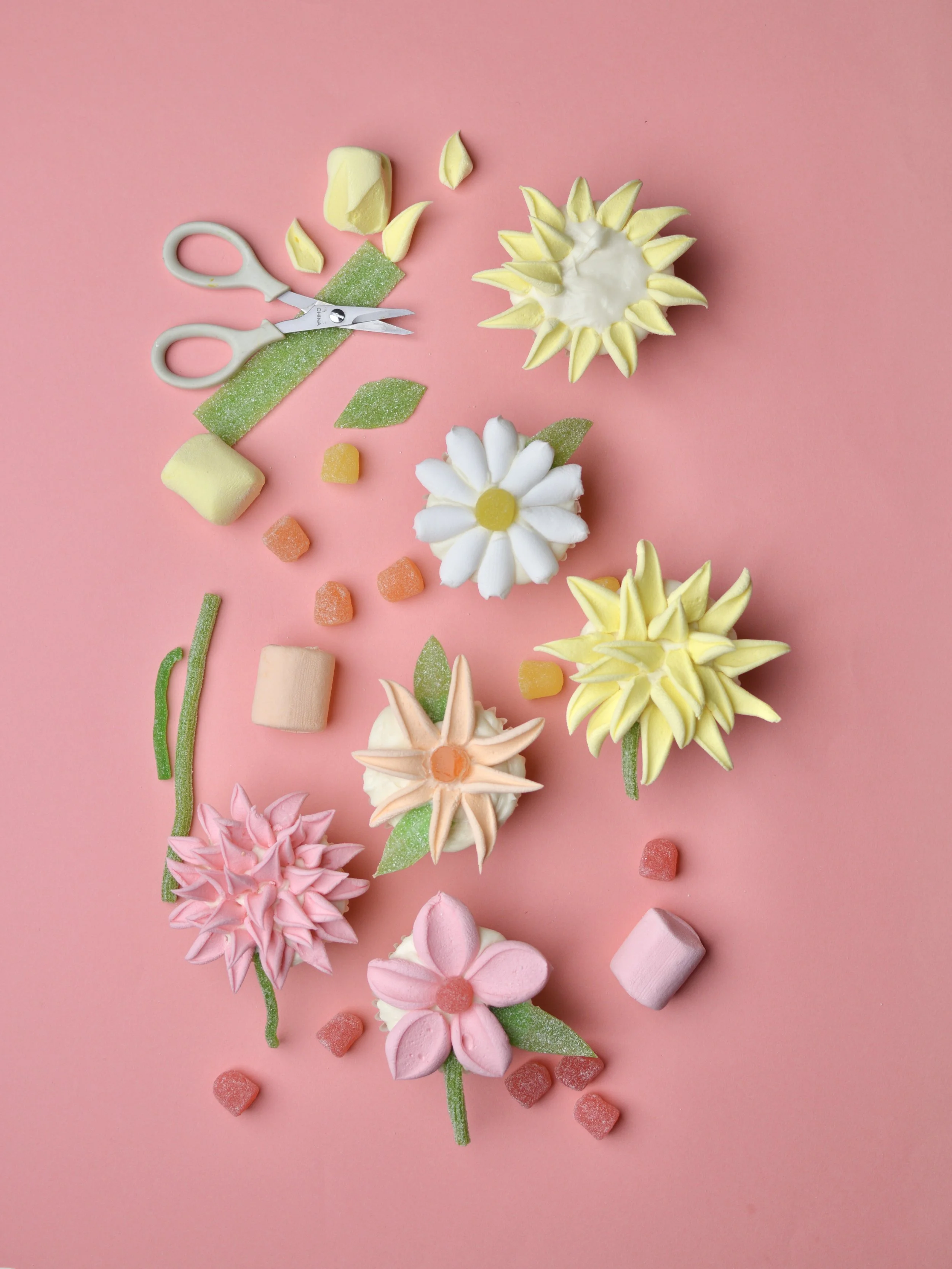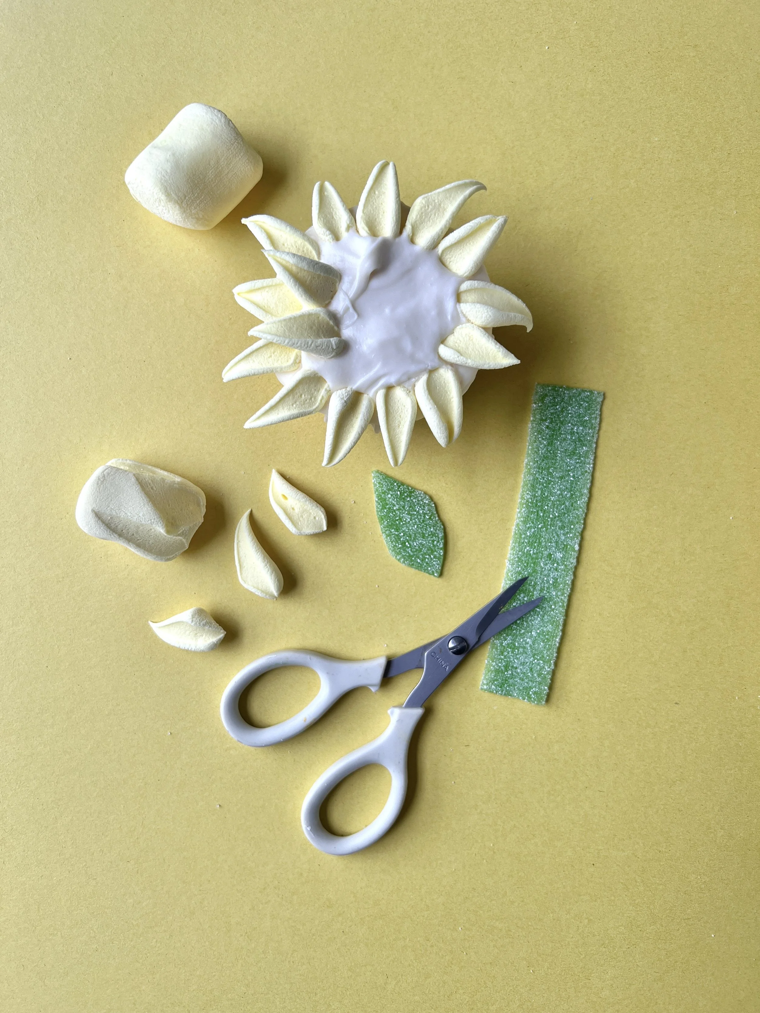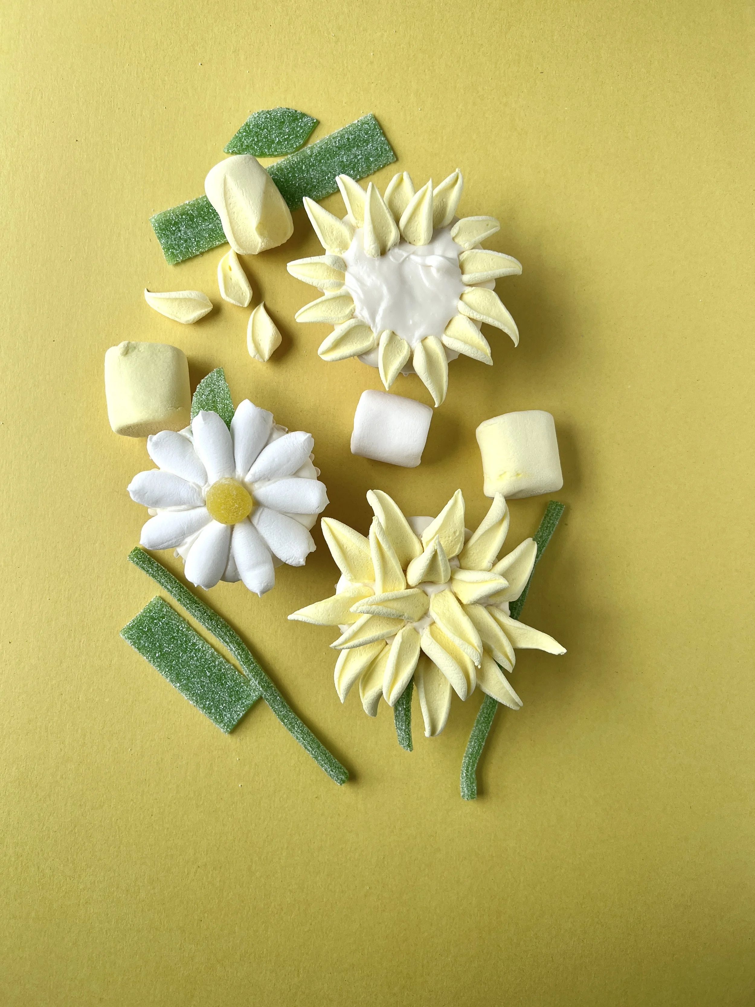 And by the way, many big supermarkets sell pastel marshmallows and sour belts or sour straws that make great leaves and stems! 🍃 And of course, the spice drops that I used for the flower center (they are gumdrops' smaller cousins).
